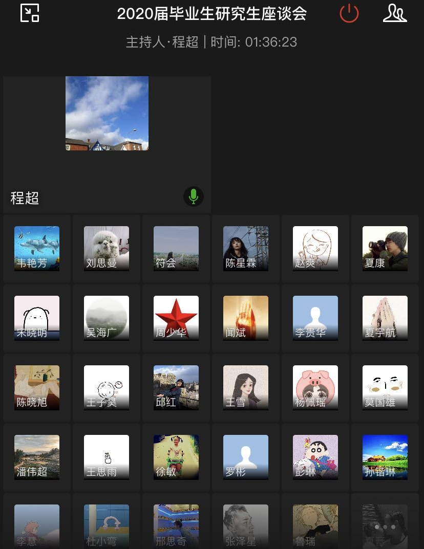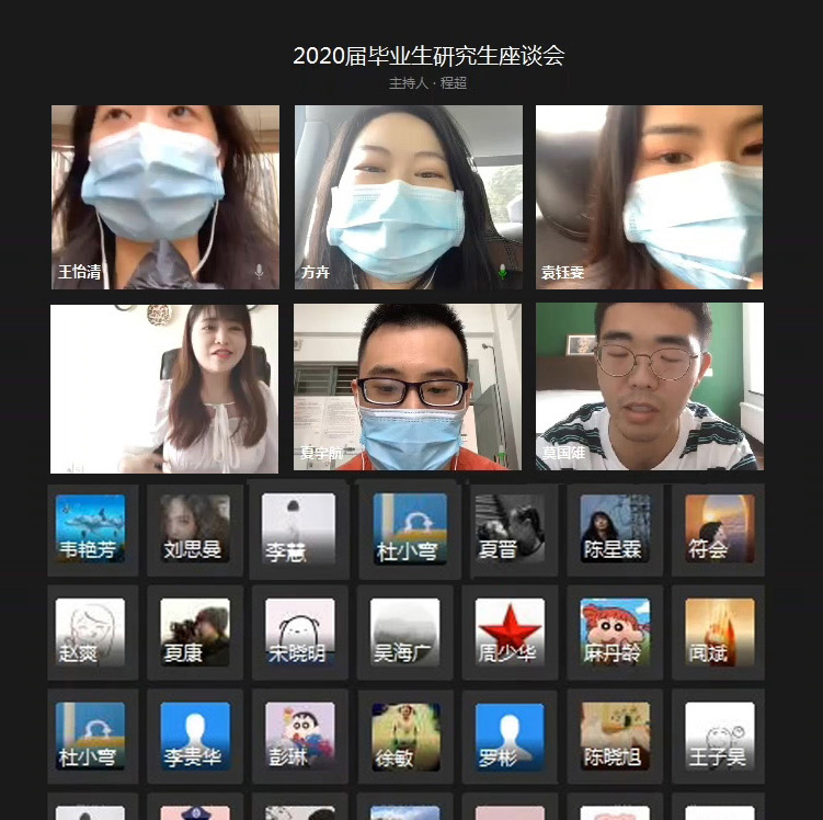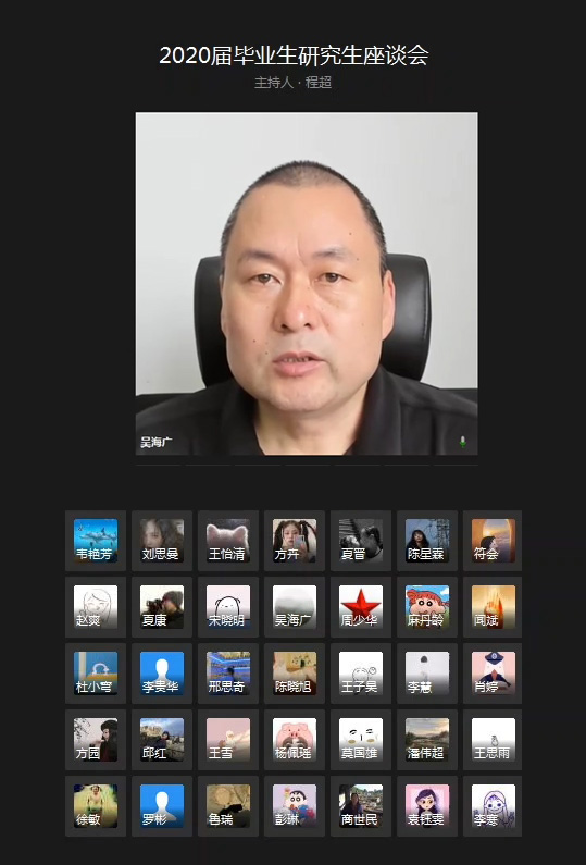 为进一步了解毕业研究生毕业情况,拉近师生距离、增强师生情感,更好地反哺学院研究生教育工作,2020年6月24日上午9点30分,美术学院通过企业微信举行了2020届毕业研究生“感恩民大情、追梦向未来”主题座谈会,会议由美术学院副院长程超教授主持,美术学院党委书记刘子元、院长吴海广教授、副院长周少华教授、平面设计方向的商世民教授、邱红教授、方园教授、环境设计方向的夏晋教授、绘画方向的罗彬教授、潘伟超教授、闻斌教授、徐敏副教授、研究生辅导员陈果老师、2017级设计艺术学专业研究生及2018级学科教学专业研究生参会。