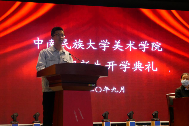 院长吴海广代表美术学院热烈欢迎2020级新生的到来,他简要介绍了学院的学科建设、专业设置、师资队伍、实践教学平台。并向新生提出殷切希望。第一是对大学生活的适应和规划,应从之前的被动学习转为主动学习,开启人生的新征程;第二是找到自己的兴趣和适合自己的学习方法;第三是希望新生们在学习奋斗的同时也要注意身心健康,保持强健的体魄和顽强的生命力;第四是希望新生们能够多读“圣贤书”。他殷切希望全体新生能够珍惜和利用学院资源,做好自我管理,找到自己人生的航标,明确前进的方向,开启人生新篇章。
