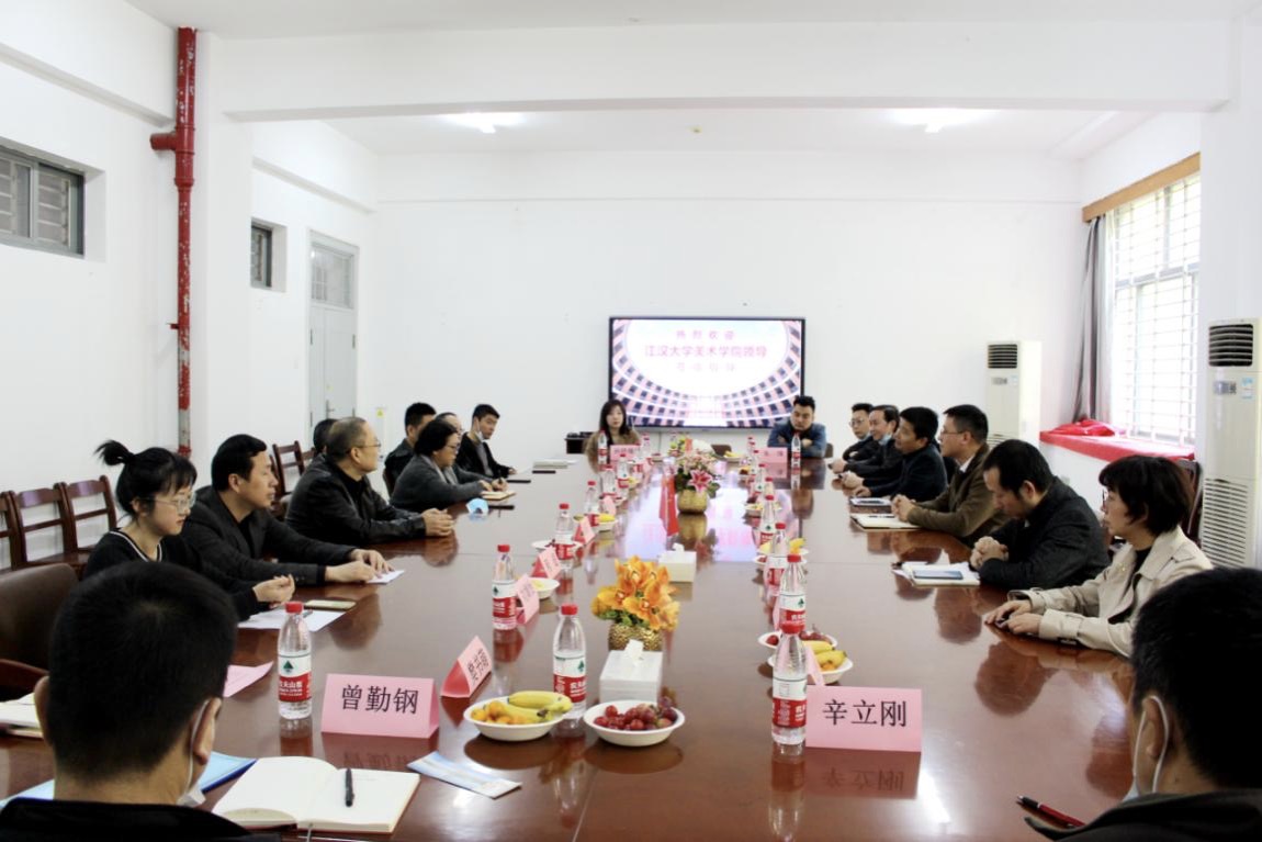 2021年4月9日上午,江汉大学美术学院书记程烜、副院长马杰、柳国良等一行14人莅临我院学习交流,我院书记刘子元、院长吴海广、分管副院长和教研室主任代表等参加交流会。首先江汉大学美术学院书记程烜对我院的诚挚接待表示感谢,并表达来访交流的意向。江汉大学美术学院副院长柳国良和副院长马杰分别对参会成员、专业特色、教师人才队伍组成和办学成果等做了详细介绍。