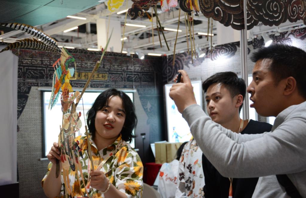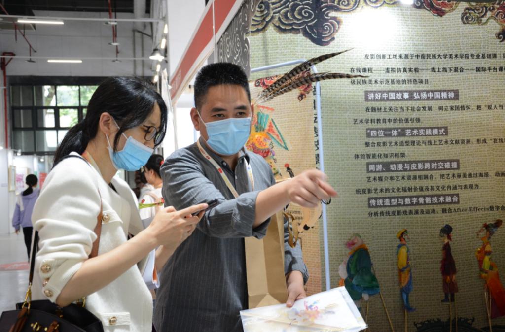 展演活动正式开始后,工作坊师生向来自全国的领导、师生观众朋友们展示工作坊创作的皮影剧——《哪吒传奇》。同时,有的观众来到工作坊操作台前就坐,经过剪影、上色、缀结等环节,体验皮影创作的过程;有的观众操作电脑,体验工作坊开发的虚拟仿真实验环节,对皮影雕刻和操纵表演进行模拟操作。