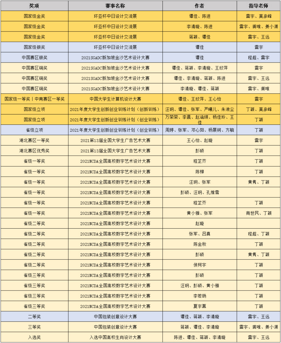 近日,2021年上半年的设计大赛获奖名单陆续公布,美术学院“雷宇丁颖设计工作室”的学生在大赛中再创佳绩。“导师设计工作室”是美术学院视觉传达设计专业探索教学方法改革的新尝试,是设计类学生课下创新实践的第二课堂。实行导师工作室制度以来,学生创新创业实践能力得到了显著提高。在雷宇、丁颖等老师指导下,该工作室学生谭佳、陈进、李清璇、蒋颖、王欣萍、王心怡、赵璇、程芷齐、汪玥、张军、彭硕、孔维雪、侯柯宇、石研博、李若旸、陈柳、陈金秋、黄小雅、杨佳玲、王佳等在上半年各类重要设计大赛中共获得奖项32项,其中国家级金奖/一等奖4项、国家级银奖/二等奖3项、国家级铜奖/三等奖4项、省级一等奖7项;获2021年度大学生创新创业训练计划国家级立项2项、省级立项1项。