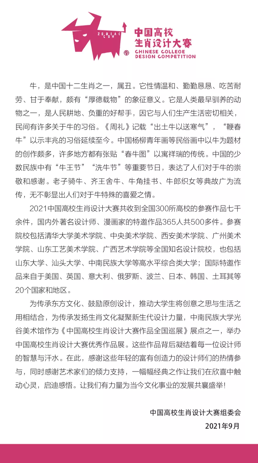 《中国高校生肖设计大赛作品全国巡展》展出2021中国高校生肖展395件作品。为传承东方文化、鼓励原创设计,推动大学生将创意之思与生活之用相结合,为传承发扬生肖文化凝聚新生代设计力量,威尼斯886699光谷美术馆作为《中国高校生肖设计大赛作品全国巡展》展点之一,举办中国高校生肖设计大赛优秀作品展。