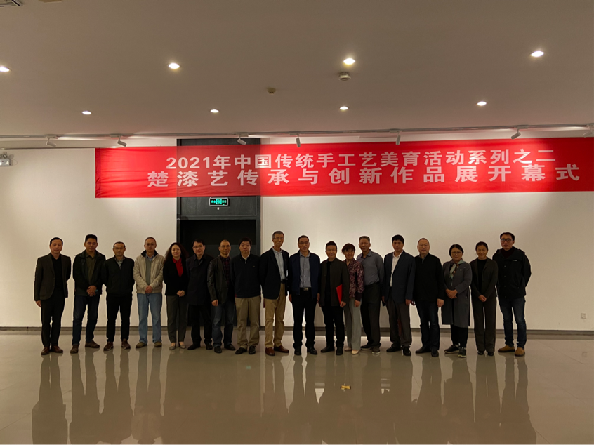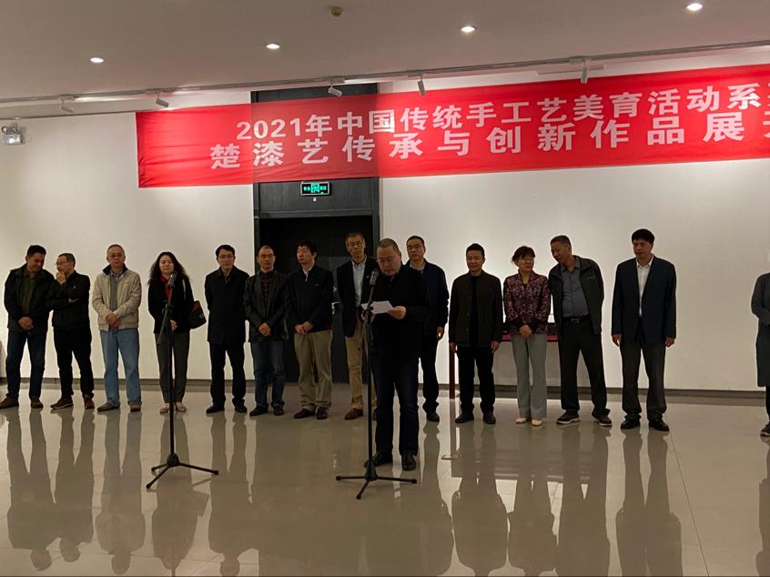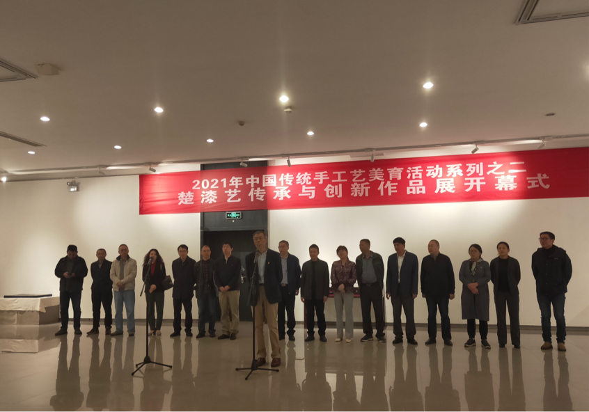 开幕式上,美术学院党委副书记、院长、美术馆馆长吴海广首先致辞。他表示希望通过此系列活动,增强大学生的文化自信和文化自觉,以艺术之光铸造时代之魂。楚漆艺造型奇特诡谲、纹饰飞扬流动、色彩艳丽繁复,在南方艺术传统之中极具代表性。在此,向筹办此次活动的各位老师表示感谢,同时也向中国工艺美术大师刘比建先生和楚式漆器髹饰技艺传承人邹传志先生表示衷心的感谢。本次活动,一方面冀望为大家重现楚漆原貌,另一方面旨在传承与创新,期待为师生们提供一个更好的平台,增添交流的机会,开拓自己的艺术视野,吸纳创新,创作出更多的具有时代性的艺术作品。