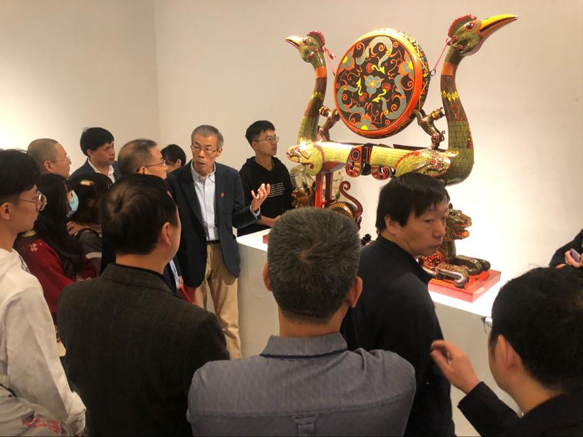 接下来,中国工艺美术大师刘比建致辞。他非常高兴能够参加此次活动,并亲切地讲述了自己与漆乐器的结缘与创作坚持之路。在今天,百花齐放、百家争鸣是机遇也是挑战,需要坚持做好自己的行业、拥有自己的个性、强化自己的技术。艺术是无声的思想,我们都是播种者,需要用艺术去陶冶世界。他希望通过此次展览,把握此次活动的机遇与老师同学们共同学习和探讨漆器艺术,共同努力,一起把这条路越走越宽。
