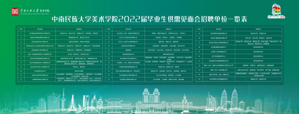在校企通力协作下,经过精心筹备,由学校招生就业工作处、美术学院主办的第二届“美美与共 携手筑梦”主题系列活动即将启动,此次共有35家企业受邀参会,招聘岗位覆盖美术设计类、新媒体、管理类、市场营销、计算机科学技术、机械工程等专业,敬请您关注和参加!