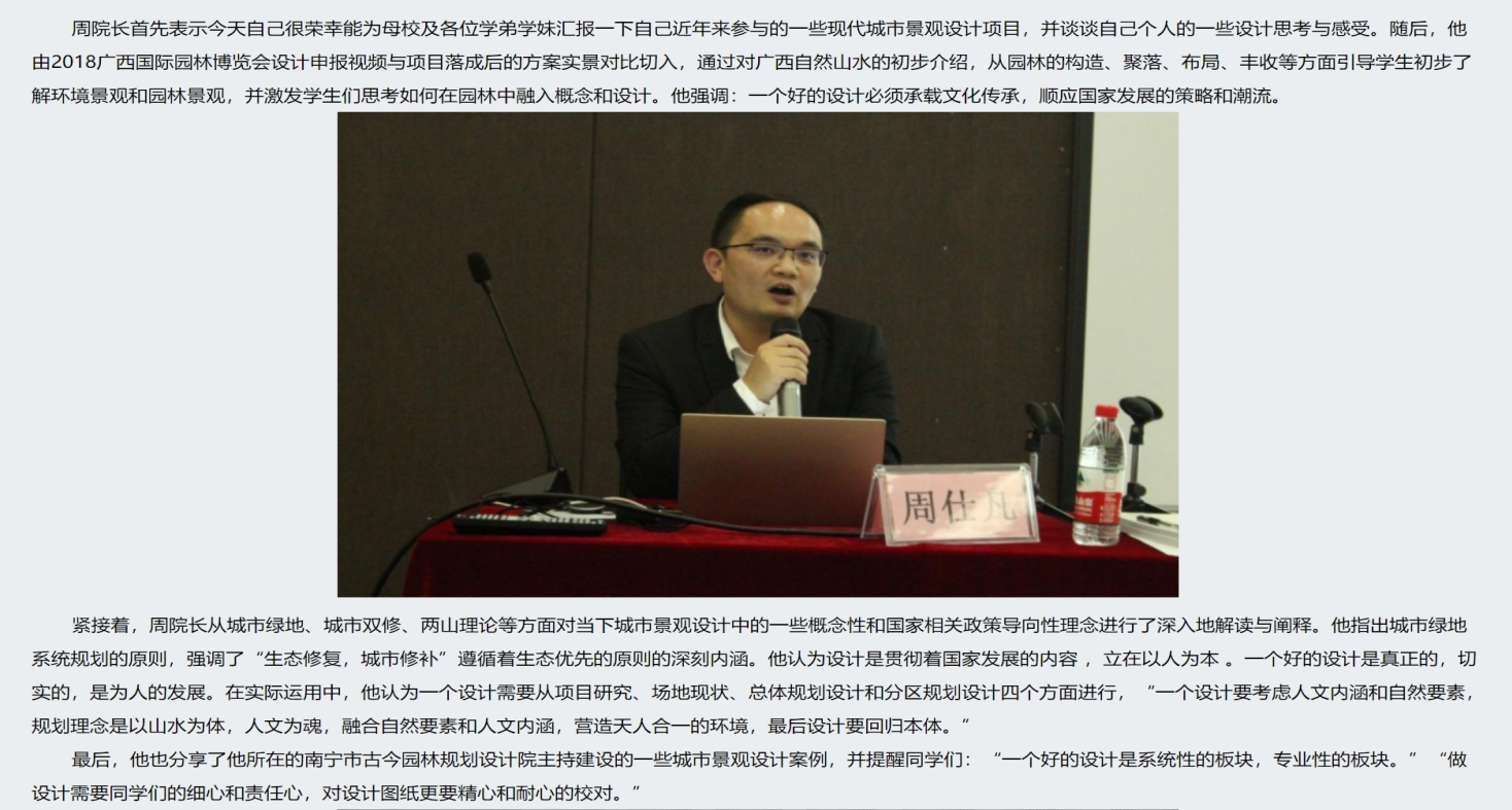 南宁市古今园林规划设计院韦护、周仕凡、曾祥杰等企业导师不再局限于实习实践活动中的帮带引导,也开始走进学院讲堂、步入课堂,开展讲座,承担课程建设,分享实践心得与硕果10余场次,实现了学校与企业、用人与育人、实习与实践的共荣与互赢;