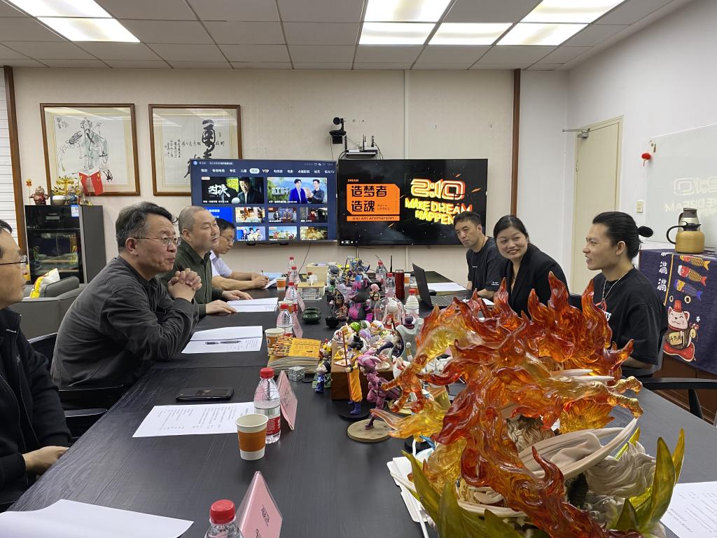 在2001级校友、两点十分公司董事长兼总经理王世勇等主要负责人的陪同下,白书记一行首先参观了武汉两点十分文化传播有限公司的制片中心、供应链中心、动捕中心等的核心部门,副总经理韩强详细介绍了公司从成立之初一步步成长为国内头部动漫企业的创业历程和业界成就。随后,双方就此次访企拓岗专项工作进行了主题座谈,公司董事长兼总经理王世勇、副总经理韩强、时光工作室研发总监肖骅以及近年毕业校友代表参加了座谈,武汉两点十分文化传播有限公司公共事务中心负责人万小兰主持座谈会。