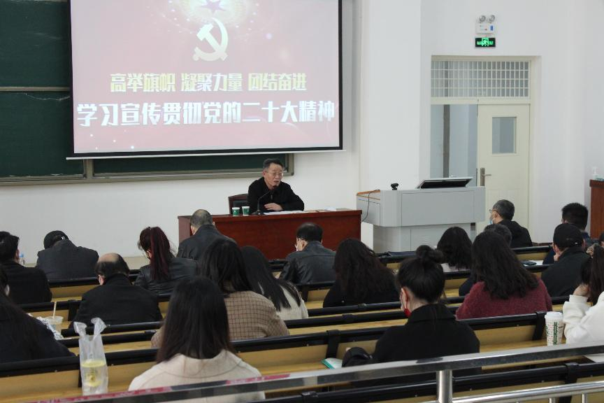 校党委副书记白江源从深刻把握党的二十大的重大意义,深刻把握过去5年的工作和新时代10年的伟大变革,深刻把握“两个确立”的决定性意义,深刻把握谱写马克思主义中国化时代化新篇章的历史责任,深刻把握以中国式现代化推进中华民族伟大复兴的使命任务,深刻把握全面建设社会主义现代化国家的目标任务,深刻把握以伟大自我革命引领伟大社会革命的重要要求,深刻把握关于发扬斗争精神、应对风险挑战的重要要求等方面,对党的二十大精神进行了全面系统深入宣讲解读。