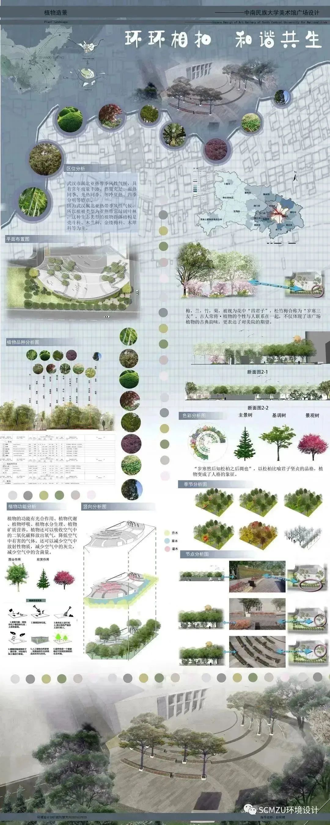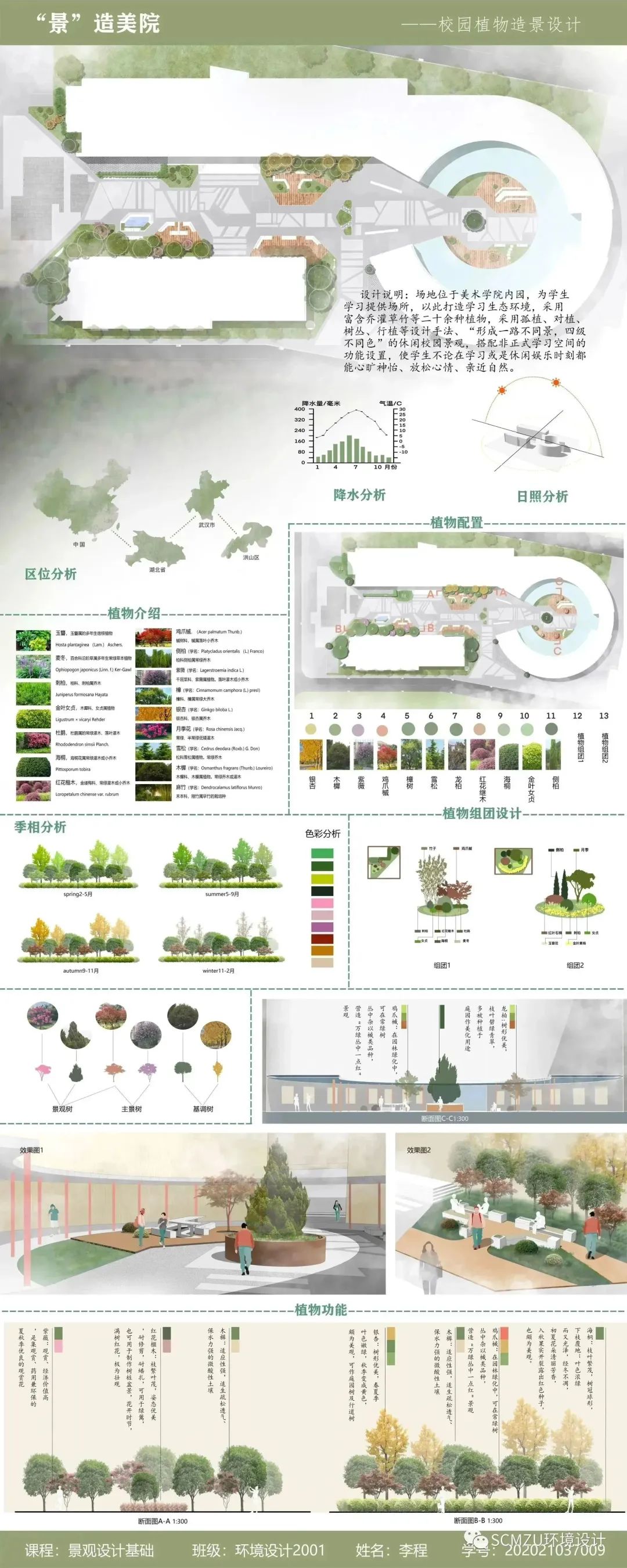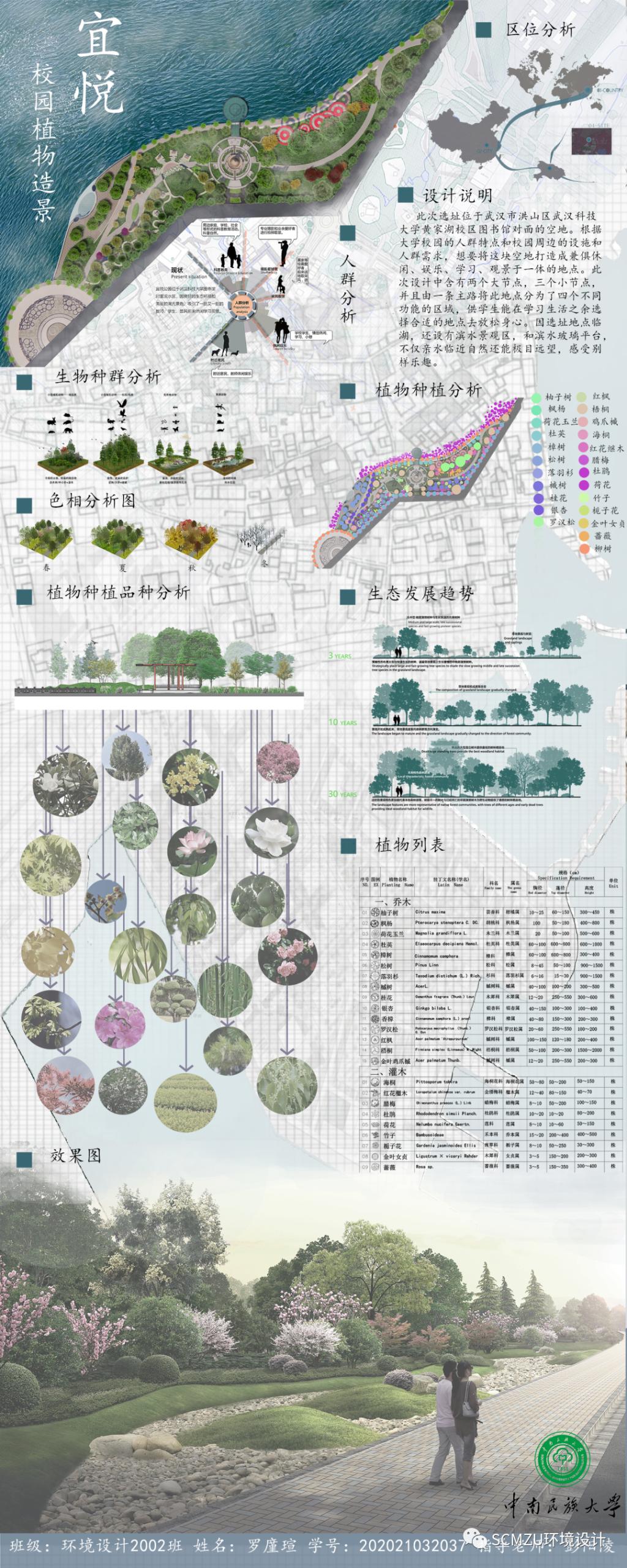 设计说明:选址于威尼斯886699美术学院(12A/12B12C/光谷美术馆)。由于原场地绿化面的确实造成建筑外表皮的裸露,大面积空旷地带造成一些列公共环境管理上所泛滥的问题,从自然主义和谐共生、美化校园环境的角度出发,发现问题并解决问题,选用不同种类的乔木、灌木与草本植物,利用其规划组合各功能区位,达成和谐统一的空间关系。