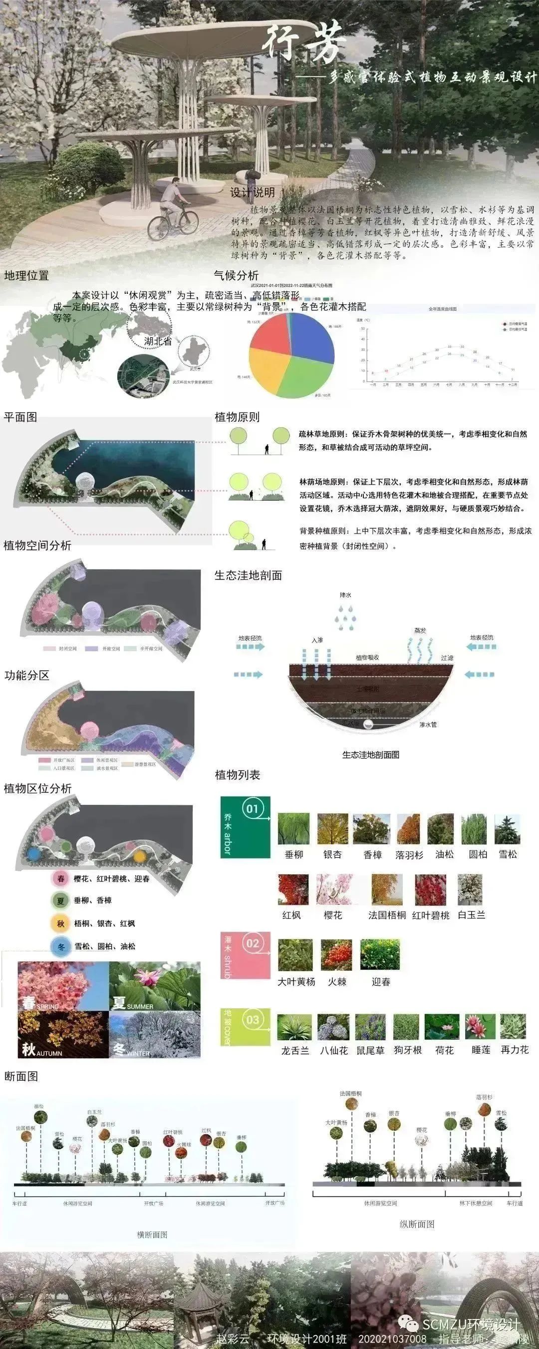 设计说明:该场地地处亚热带,是亚热带季风性湿润气候,光照充足,降水充沛,夏季高温多雨,冬季温和湿润。主要以当地本土植物为主,根据季节气候变化的不同增添些许季节变化较明显的植物,营造出色彩丰富的景观环境,做到一年四季有花可看,有景可赏。