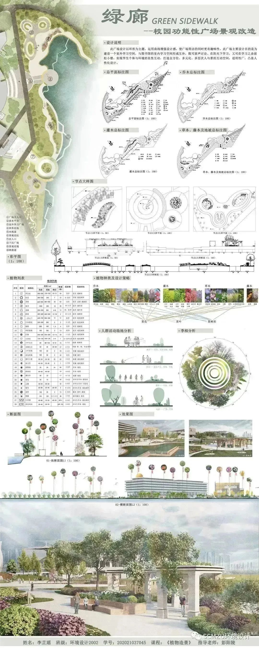 设计说明:在场地内对植物种植进行了全新的设计,增加了高大乔木和小型乔木,丰富了灌木的种类,绿化率增多,植物种类更加丰富,使人接触大自然,亲近大自然,营造具有包围感,互动感的绿色生态环境。