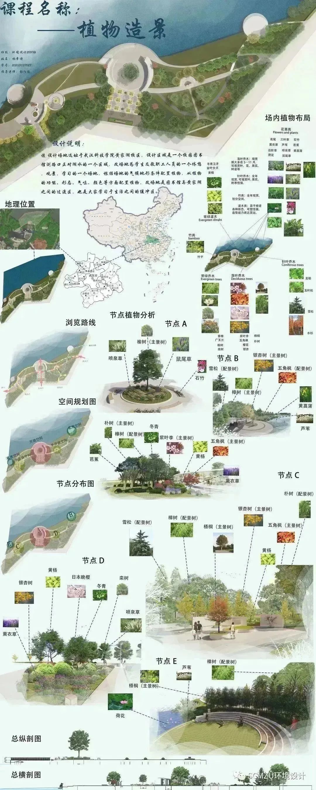 设计说明:本案选址于武汉市武汉科技大学黄家湖校区图书馆外围滨水地块进行绿地景观设计,通过对生态,交流,文化,观赏等多维度因素,在考虑以人为本基础融合了曲水流觞的文化内核。基于植物造景的理论,考虑到植物的四季变化,因地制宜等功能性因素。通过植物造景来营造一个令人身心愉悦,自然优美的氛围。