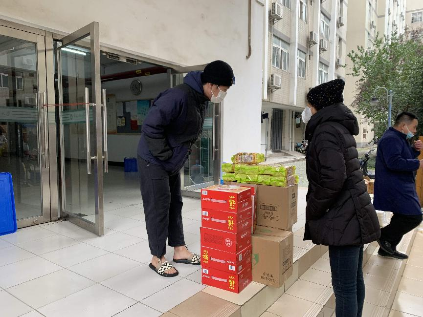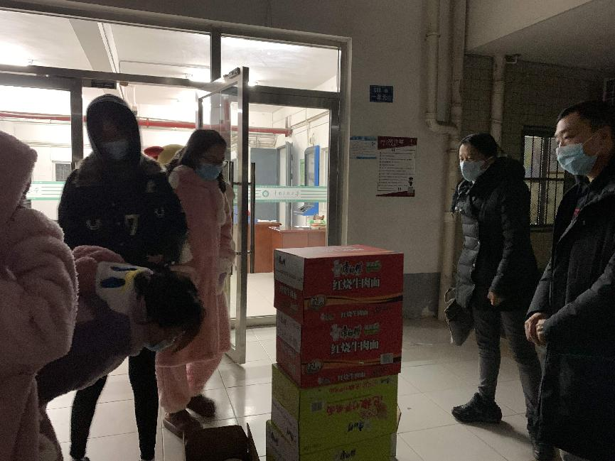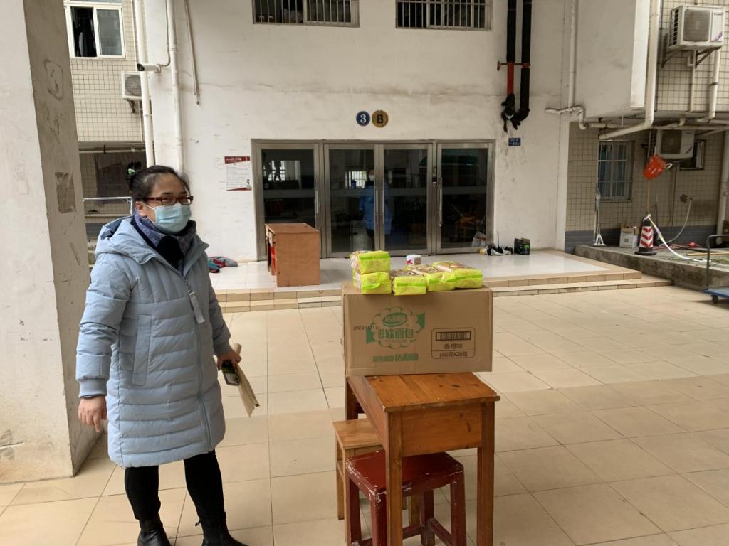 上系列图为教职员工、学生志愿者配送、分发爱心小零食。