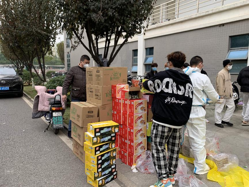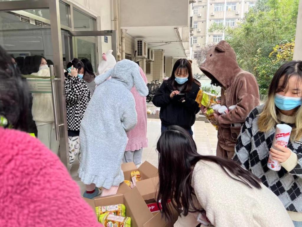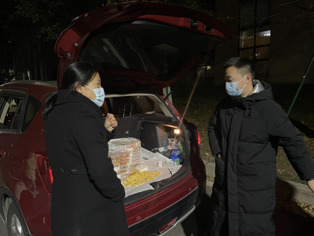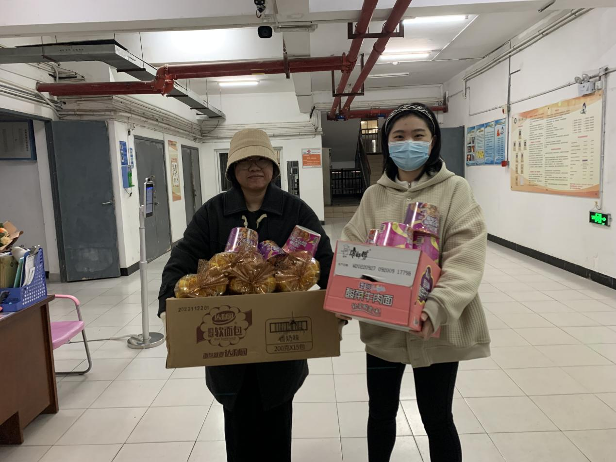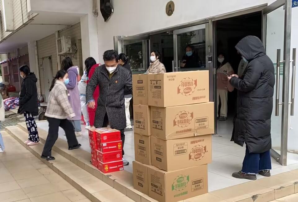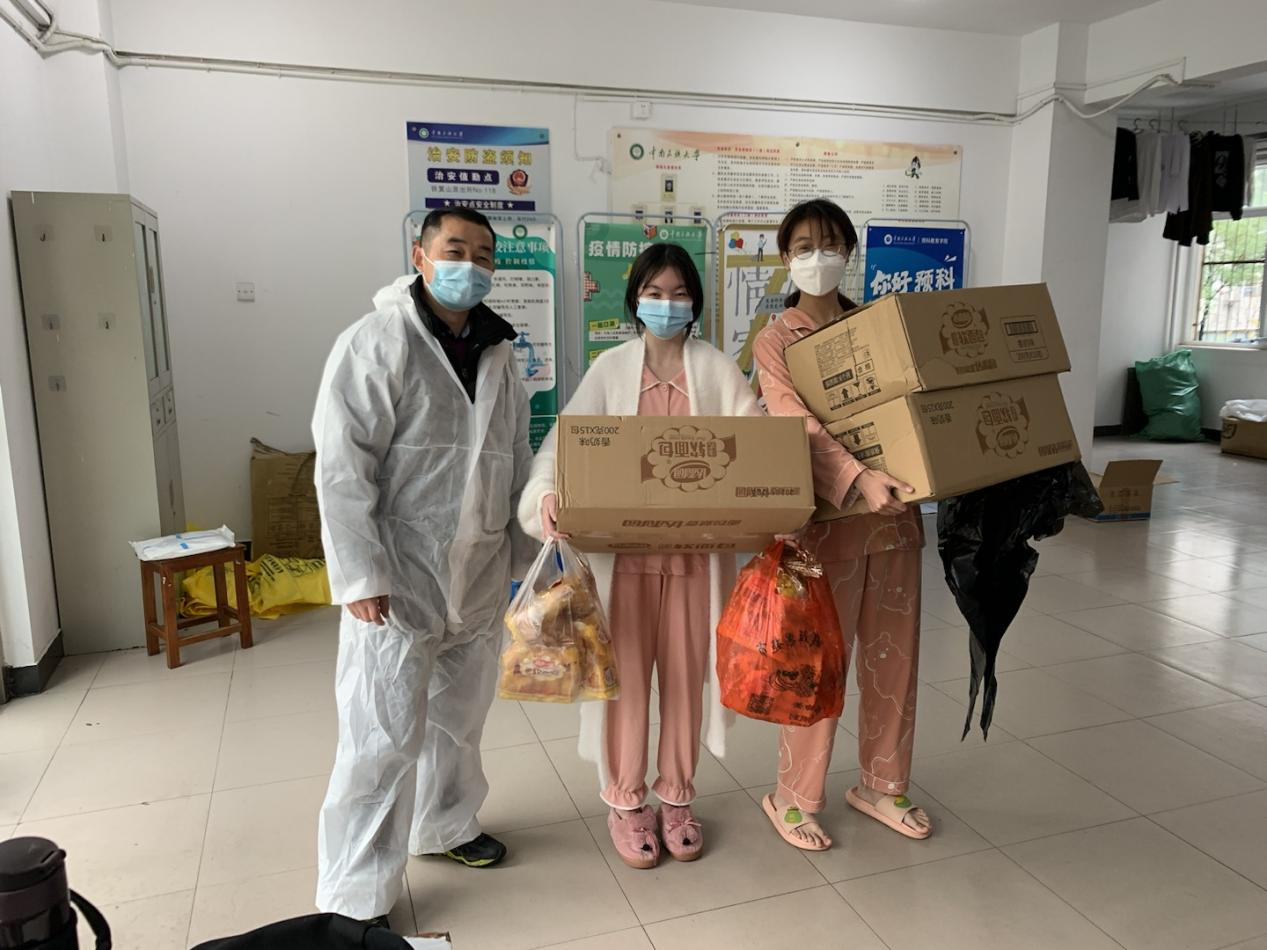 从协助食堂打菜装饭到配送必要物资,老师们动用一切力量联系商家购买物资、来回穿梭于南北区各个宿舍楼,为学生们配送饮用水、面包、泡面、火腿肠、八宝粥等爱心小零食和药品等急需物资。几番不同场景的工作持续下来,已分不清是凝结在头发上的水珠是雨水还是汗水。一句“有什么需要的,随时联系老师”是激励教职员工为保障同学们正常学习、生活忘我奋斗的“强心剂”,身体上的劳累和寒湿瞬间消退。