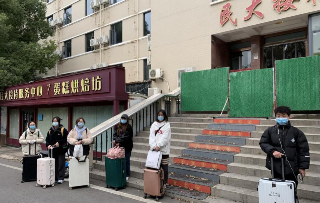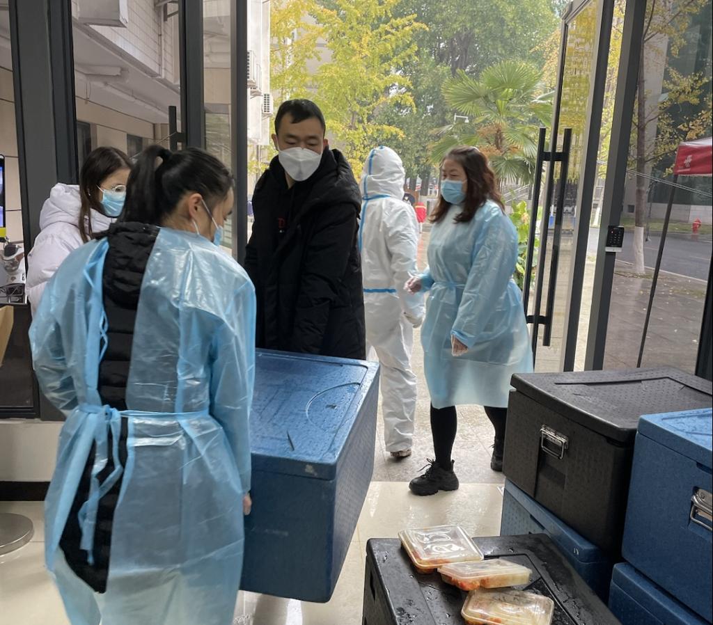 教师志愿者在学生宿舍楼栋值守。近期,室外气温一度达到零下且降水频繁,为在学生宿舍的楼栋值守工作带来不小的挑战和困难。每天早晨7:00到晚上10:00,参加值守的老师们开启超长待机模式,克服身体上的困难,同时还要及时处理工作上的事务。老师们在值守楼栋的安全范围内为楼栋内学子解决和处理快递取送、餐食保供问题,指导核酸检测秩序,引导同学们有序参加定点居家观察。