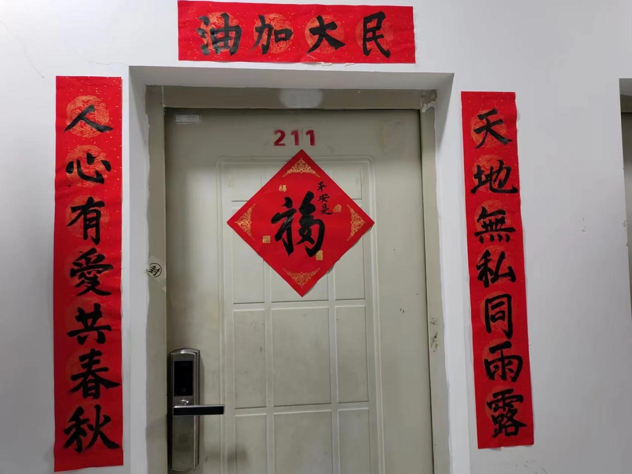 同时,学院党委高度重视学生们的心理建设和情感疏导。学院领导、辅导员和班导师多次与同学们组织专题线上会议和专门谈话,充分了解学生所想、所述,及时掌握同学们的诉求和困难,确保学生能够在特殊时期保持身心健康,全力投入到学习和生活中。美院学子发出祝福或写下激励人心的春联贴在宿舍区,“美院加油”、“天地无私同雨露 人心有爱共春秋 民大加油”,鼓励着奋斗在不同岗位的老师和学子们。
