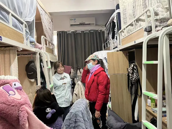 肖老师走访了学生们的寝室,了解了学生考试及课程作业完成情况,察访了同学们开学以来的生活状况,询问新学期的课程安排和同学们的学习计划,深切关心学生们的身心健康,并且统计全班学生中感染康复人员,强调常态化防疫的重要性。