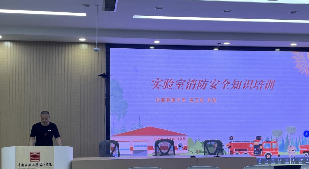 培训中,朱溢副处长通过多媒体演示,对高校实验室火灾案例,实验室火灾事故的发生、预防和处理,如何避免火灾事故,校园消防巡查、训练等方面进行了详细讲解。