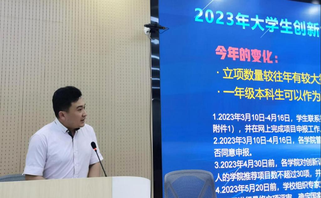 接下来,王海涛老师就大学生创新创业训练计划项目和相关竞赛的赛事要求、时间节点及注意事项进行详细介绍。首先他介绍了2023年大学生创新创业训练计划立项申报的变化和学院申报进度;接着就2023年第15届全国大学生广告艺术大赛、2023第十一届未来设计师全国高校书字艺术设计大赛和2023年第九届中国国际“互联网+”大学生创新创业大赛的相关内容和时间节点进行介绍;最后王老师就学生干部如何在具体实践过程中做好通知传达、组织同学们参赛,并就赛事收件过程中容易出现的问题提出建议和对策。
