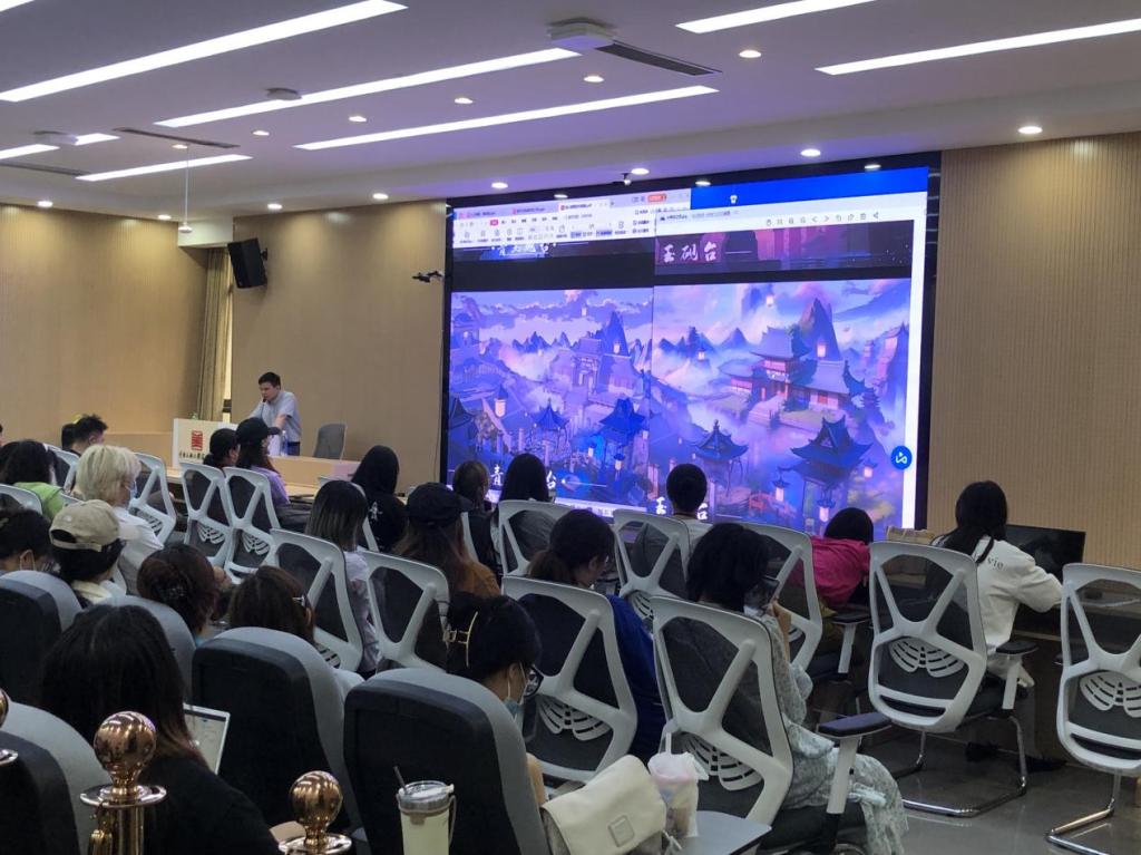 会议开始,付文对武汉奇天动漫有限公司的成立与定位做了讲解,随后用许多案例向同学们展示了现阶段AI在美术行业的发展程度。付文表示,AI的发展对艺术设计行业产生冲突是必然的,比起焦虑,更重要的是我们应该如何正确看待、利用它。付文分析道,AI作为一个提升工作效率和提供工作方案的工具,仍需要人为掌控和后期修改,我们需要做的就是持续学习,将AI作为自己的一项技能,并培养自己的核心优势,进一步提升自己的专业能力与行业竞争力。随后,付文详细给同学们演示了如何利用AI软件进行创作,如生成插画、海报、设计方案等,同学们也展现出浓厚的兴趣。