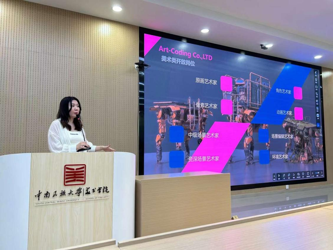 座谈会上,李斯琦首先结合数字艺术分类结合相关案例,让同学们大致了解了数字艺术领域的分类;接着,李斯琦带领同学们了解了游戏美术制作、游戏美术应用、次世代创作、数字大屏、像素艺术分别是什么,需要怎样的专业技能和能力;随后,李斯琦就当前市场岗位分类与美术专业就业方向的关系进行讲解,让同学们明确了自己在相关行业中能做什么和希望做什么。会议最后,李斯琦老师对同学们提出的疑问进行了细致解答。