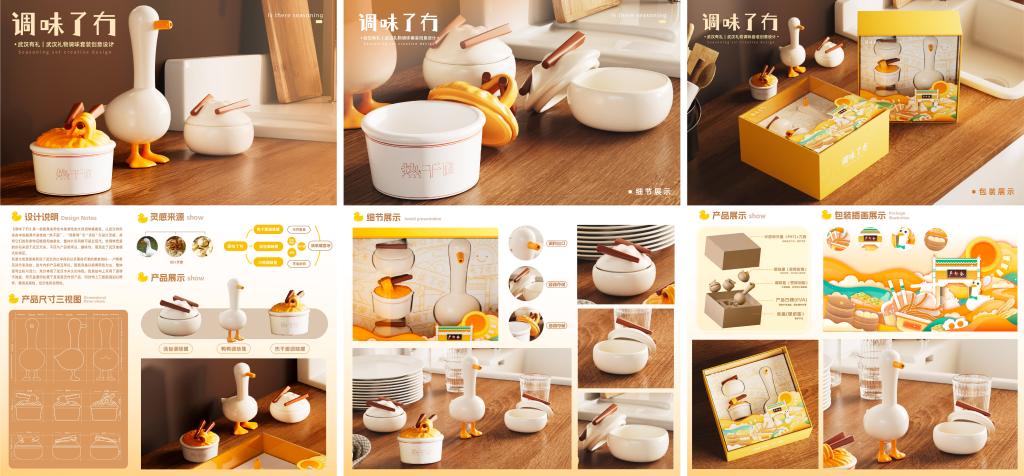 大赛开赛以来,雷宇教授带领团队展开构思和创意,从多个角度进行分析、思考、提炼,不断完善打磨产品设计稿,最终获奖。作品《调味了冇·武汉礼物文创调味套装设计》以武汉特色美食中的最具代表性的“热干面”、“汤包”和“鸭脖/周黑鸭”为灵感,并将它们的形象特征概括和抽象化,形成一套兼具实用性与地域特色的创意调味罐套装产品。