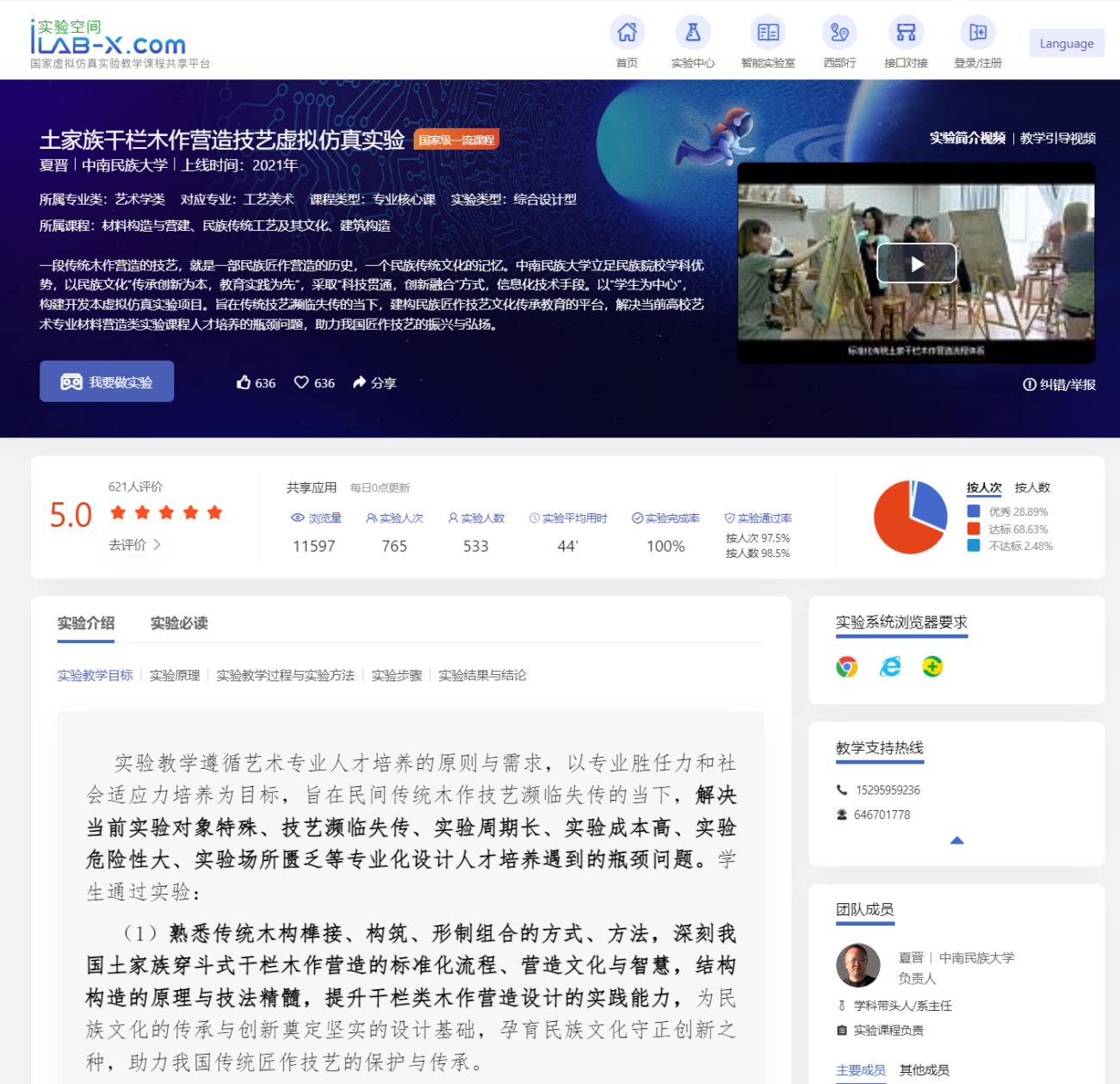 干栏木作营造技艺是我国最具特色的匠作手工技艺之一,其传统的木构榫接、穿斗营造技艺更是我国千百年来匠作技艺传承的智慧结晶与技术精髓。课程以传统土家族穿斗木构营造技艺为基础,规范干栏木作营造技术流程与实验操作要领。由四个模块组成,共计6学时。其中,构基础是认知前提,包括了传统木作榫卯工艺、节点构件的认知,以三维动态拆组的方式,实现对木作构件组合与解构的认知;动手教是文化梳理,以土家爷爷讲述的方式,情境化再现土家木作营造的文化;考练合是核心内容,通过考练结合方式,规范实验步骤与仿真实验技术练习,完整呈现土家干栏木作从选址到架接,直至盖瓦装饰的全过程,并在实验练习的关键环节中设定了考核点,实时交互反馈学习情况;自主搭则是探究学习和拓展,学生可在平台提供的编辑器和模型库中,自由选择搭建作品,也可线上线下随时随地开展练习,激发学习兴趣,提升实践能力。