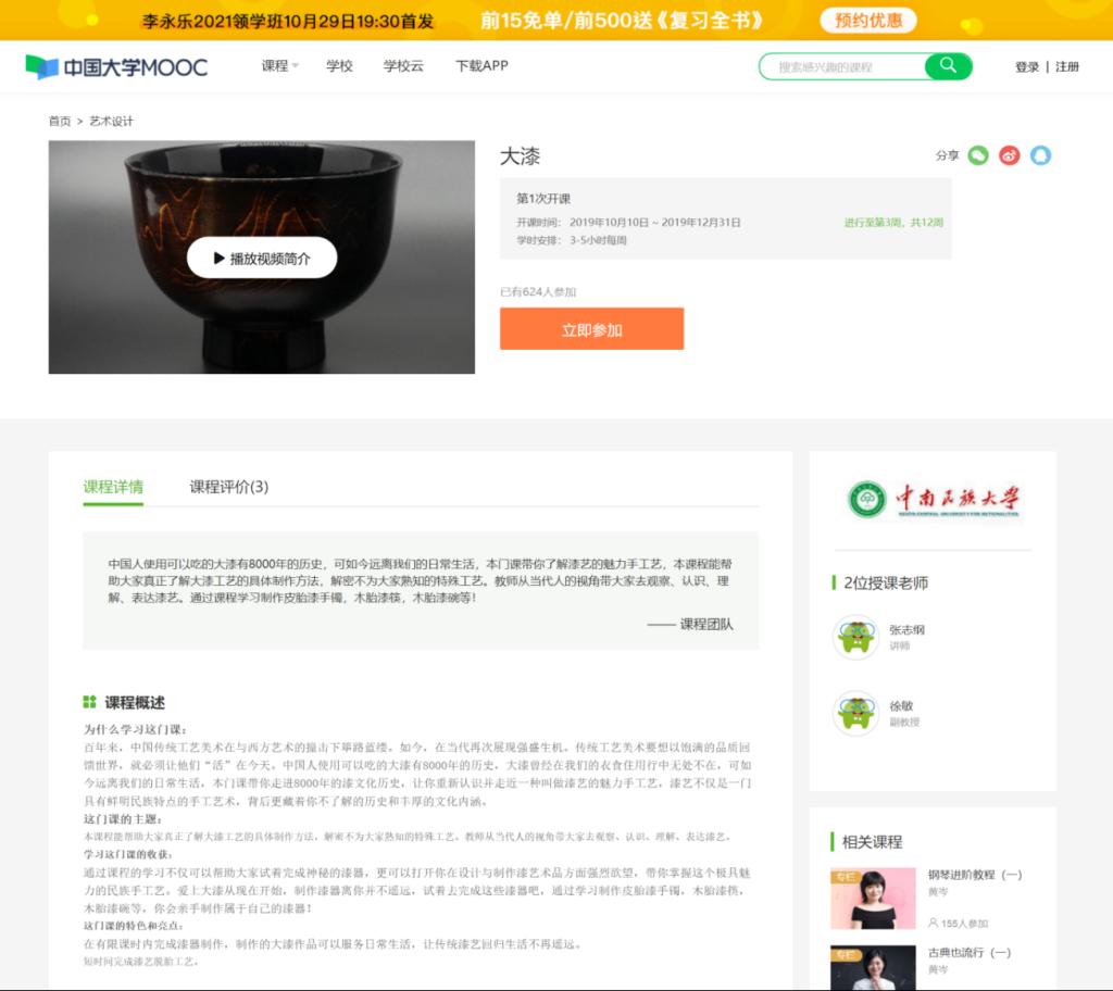 百年来,中国传统工艺美术在与西方艺术的撞击下筚路蓝缕。如今,在当代再次展现强盛生机。传统工艺美术要想以饱满的品质回馈世界,就必须让他们“活”在今天。中国人使用可以吃的大漆有8000年的历史,大漆曾经在我们的衣食住用行中无处不在,可如今远离我们的日常生活,本门课带你走进8000年的漆文化历史,让你重新认识并走近一种叫做漆艺的魅力手工艺,漆艺不仅是一门具有鲜明民族特点的手工艺术,背后更藏着你不了解的历史和丰厚的文化内涵。通过学习制作皮胎漆手镯,木胎漆筷,木胎漆碗,亲手制作属于自己的漆器,掌握这个极具魅力的民族手工艺。