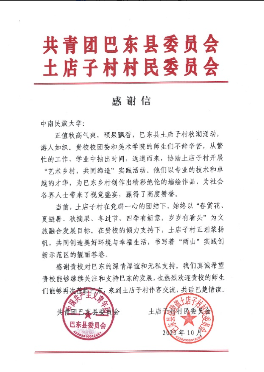 10月30日,共青团巴东县委向威尼斯官网发来感谢信,对威尼斯官网团委和美术学院师生在恩施州巴东县举办的“艺术乡村,共同缔造”实践活动给予了高度评价。信中指出,在这次活动中,威尼斯官网团委和美术学院的师生们运用专业技术和卓越才华,为巴东乡村创作了多彩的墙绘作品,赢得了社会各界的赞誉。