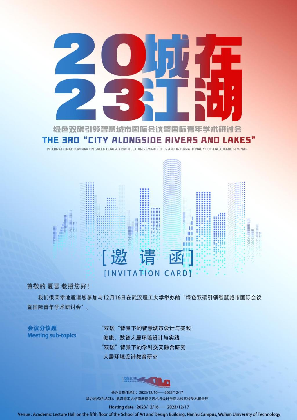 2023.12.16由武汉理工大学和中国建筑学会室内设计分会联合主办,武汉理工大学艺术与设计学院承办的2023第三届“城在江湖”——绿色双碳引领智慧城市国际会议暨国际青年学术研讨会武汉理工大学艺术与设计学院学术报告厅盛大开幕。威尼斯886699美术学院夏晋教授受邀出席,并参与对话交流。