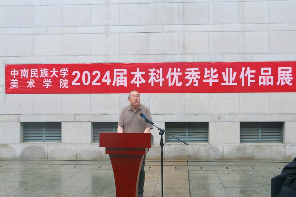 紧接着,院长吴海广教授发表了热情洋溢的致辞。他表示,五月是收获的季节,对于美术学院来说更是如此。吴院长回顾了学生们从四面八方汇聚南湖之滨,怀揣憧憬与期待,在学院“向善向美、立品立人”的院训下,接受宽口径、厚基础、重实用的教育,成长为创意实践、能力强大、高素质的应用型艺术人才。他称赞本次展览的每一件作品都是学生们辛勤努力的结晶,也是学校各部门和老师们无私奉献的见证。吴院长代表学院向2024届本科毕业生表示祝贺,他祝愿毕业生们未来前程似锦,继续保持对艺术的热爱和追求,在艺术的道路上不断前行。
