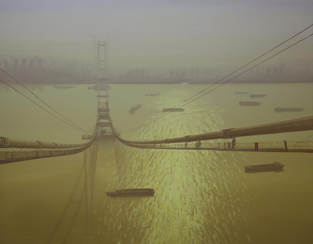 作品《长虹卧波》取材武汉长江上的建桥场景,在宽阔的水面上空,大桥缆索横跨,气势如虹。作品描绘了现代建桥技术下,劳动人民不断创造天堑变通途的新壮举,实现古人“长虹卧波”的理想图景,借古咏今,歌唱伟大新时代。