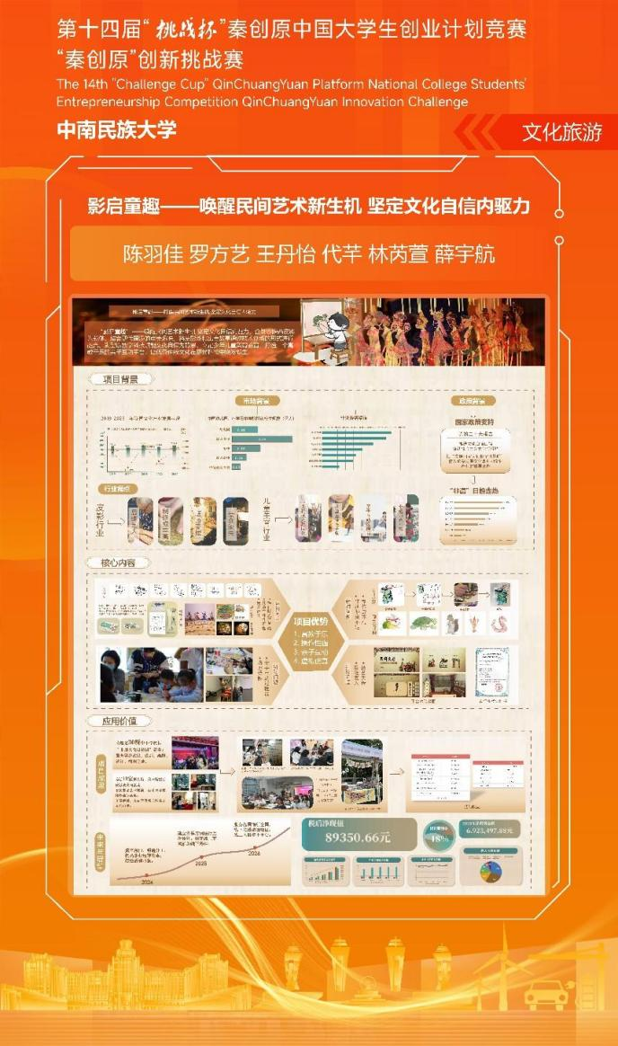 10月29日至11月2日,由共青团中央、教育部、人力资源社会保障部、中国科协、全国学联、陕西省人民政府共同主办的第十四届“挑战杯”秦创原中国大学生创业计划竞赛全国决赛终评在西安交通大学(兴庆校区)举行。美术学院参赛项目《影启童趣——唤醒民间艺术新生机,坚定文化自信内驱力》获得银奖,实现了美院学子在国家级A类赛事获奖成绩的新突破。