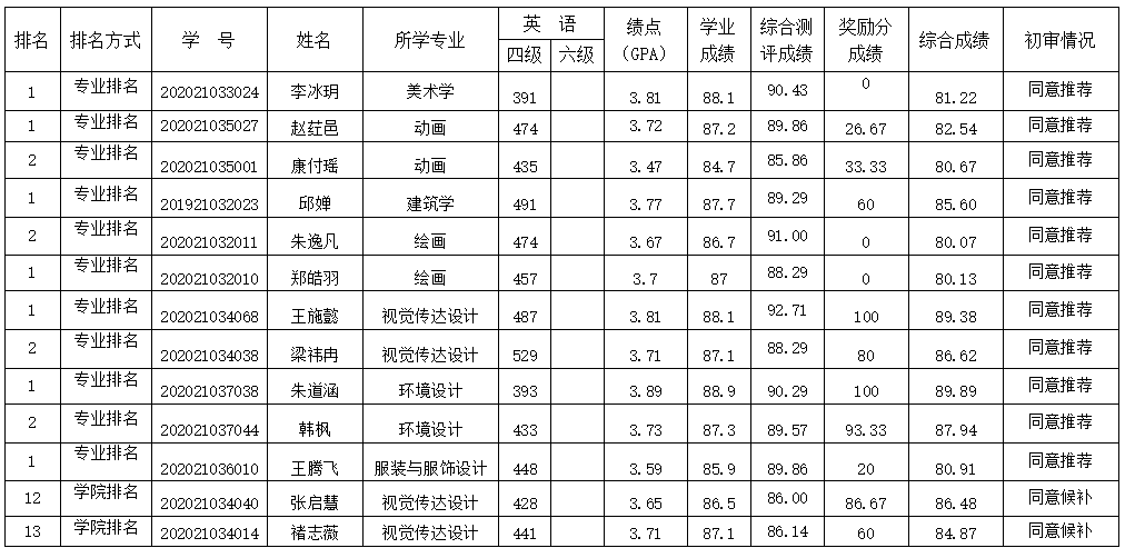 根据《威尼斯886699推荐优秀应届本科毕业生免试攻读硕士学位研究生遴选办法(修订)》(民大教学〔2016〕12号)和《美术学院2024届本科生推免工作实施细则》,我院遵循公开、公平、公正的原则,经学生个人申请,学院对申请免试攻读硕士学位的2024届毕业生经过报名资格审查、学业成绩核算、奖励加分认定、综合测评考核等环节工作,并经学院党政联席会研究决定,现将美术学院2024届本科生推免结果公示如下:
