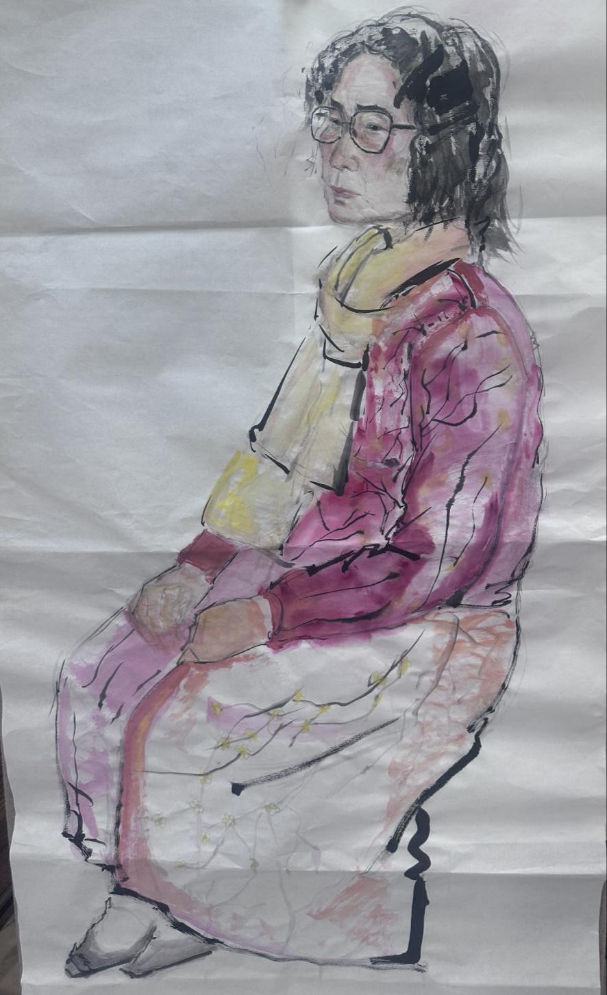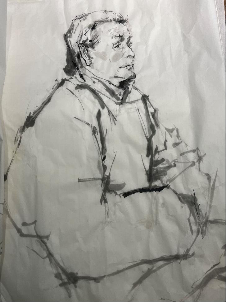 通过陈岱老师的示范,让我们了解到无论是粗犷的泼墨还是细腻的勾勒,都能表现出人物的形体神态。通过前期的反复观摩与临摹,我们渐渐领悟到空白亦是画的一部分,它与实体共同构建了作品的呼吸感与流动美。在课程学习里,我们更加深刻地理解了“写意”不仅仅是一种绘画技法,更是一种艺术表达方式,它要求画家在创作中追求意境和情感的传达,而不仅仅是形象的再现。写意人物画强调线条的流畅和笔墨的变化,我们在实践中学习了如何运用笔墨的浓淡、干湿来表现人物的神态和气质,这对提升我们的绘画技巧有很大帮助。在陈岱老师的课堂上,师生之间的交流频繁而热烈,同学们每个人都有自己的见解和创作风格,大家一起交流学习,共同进步。