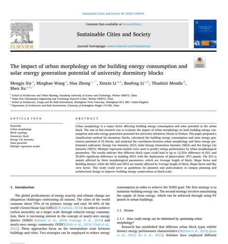 近日,我院环境设计系建筑学专业谢孟举老师作为第一作者于2023年发表在中国科学院一区期刊《Sustainable Cities and Society》上的研究论文“The impact of urban morphology on the building energy consumption and solar energy generation potential of university dormitory blocks” 成功入选ESI全球前1%高被引论文。这标志着该研究成果在全球学术界获得了广泛关注与高度认可,充分展现了其重要的学术价值和影响力。