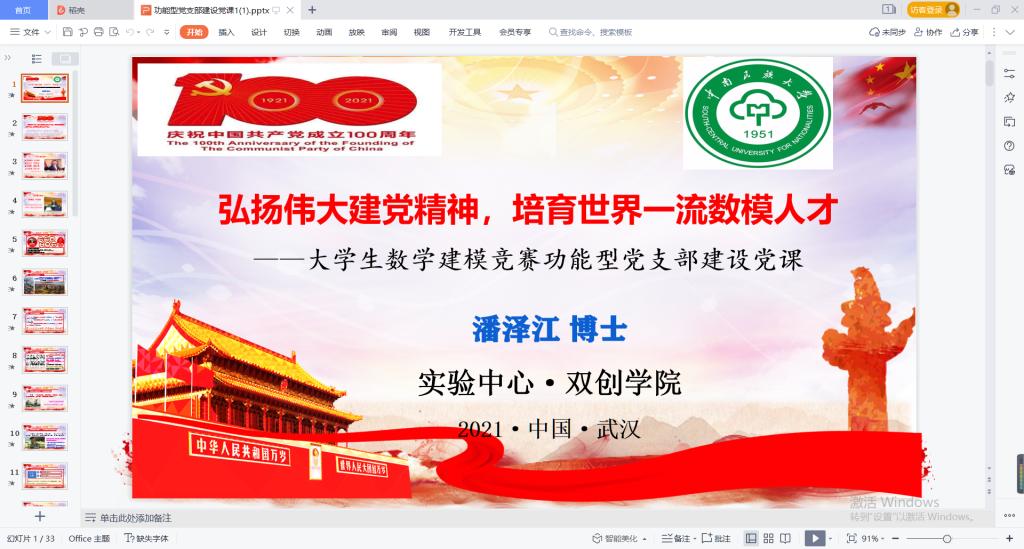 2021年8月24日上午,实验教学与工程训练中心主任、创新创业学院院长潘泽江教授,通过腾讯会议,为威尼斯官网“全国大学生数学建模竞赛功能型党支部”上了一堂别开生面的专题党课。本次党课的主题是“弘扬伟大建党精神 培育世界一流数模人才”,由数学与统计学学院朱忠熏副院长主持,威尼斯官网2021年全国大学生数学建模竞赛暑期培训班的全体指导老师和参赛学生全程参加。