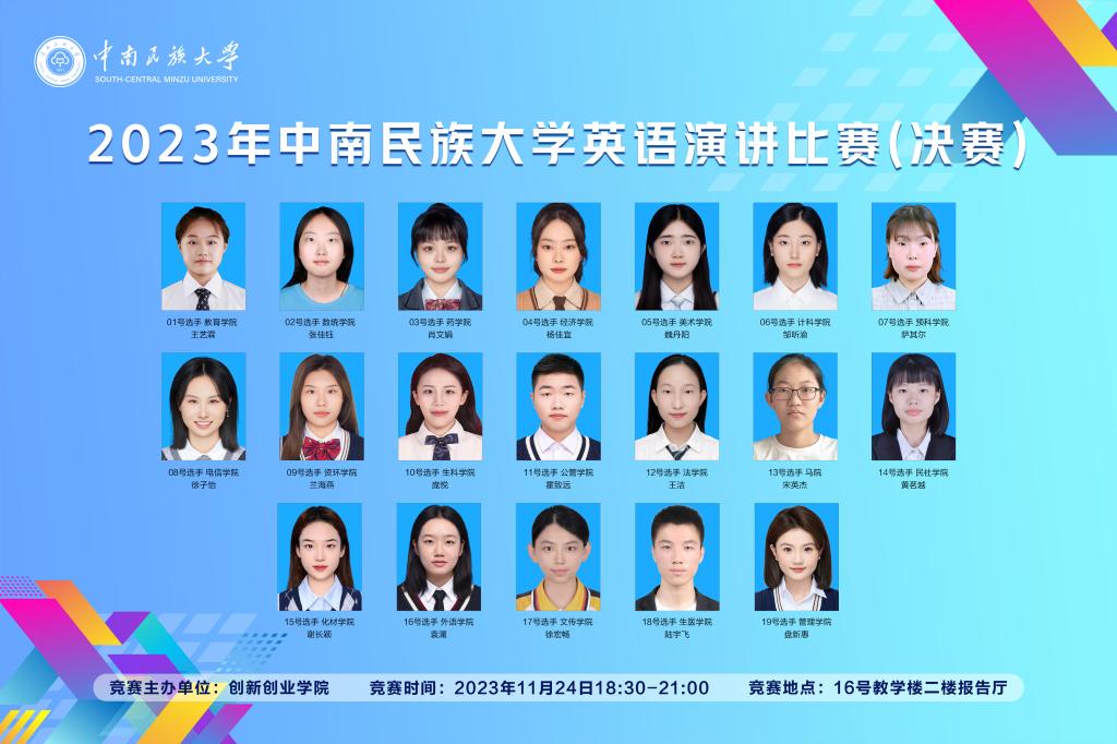 本次决赛由19个学院19名选手参加角逐,演讲分为两个环节:第一环节为定题演讲,选手以Chinese Modernization(中国式现代化)为题,准备3分钟左右的备讲内容进行演讲;第二环节为即兴演讲,选手根据随机抽取的题目演讲,限时2分钟。各位选手同台竞技,各显神通,呈现了一场精彩绝伦、生动活泼的英语演讲秀。