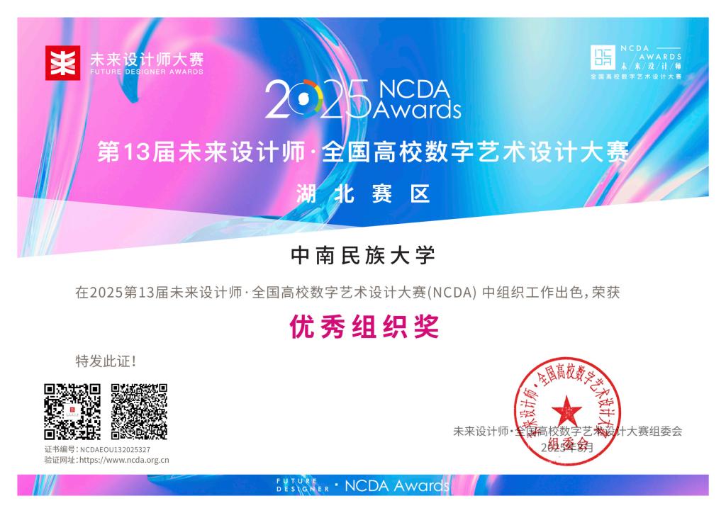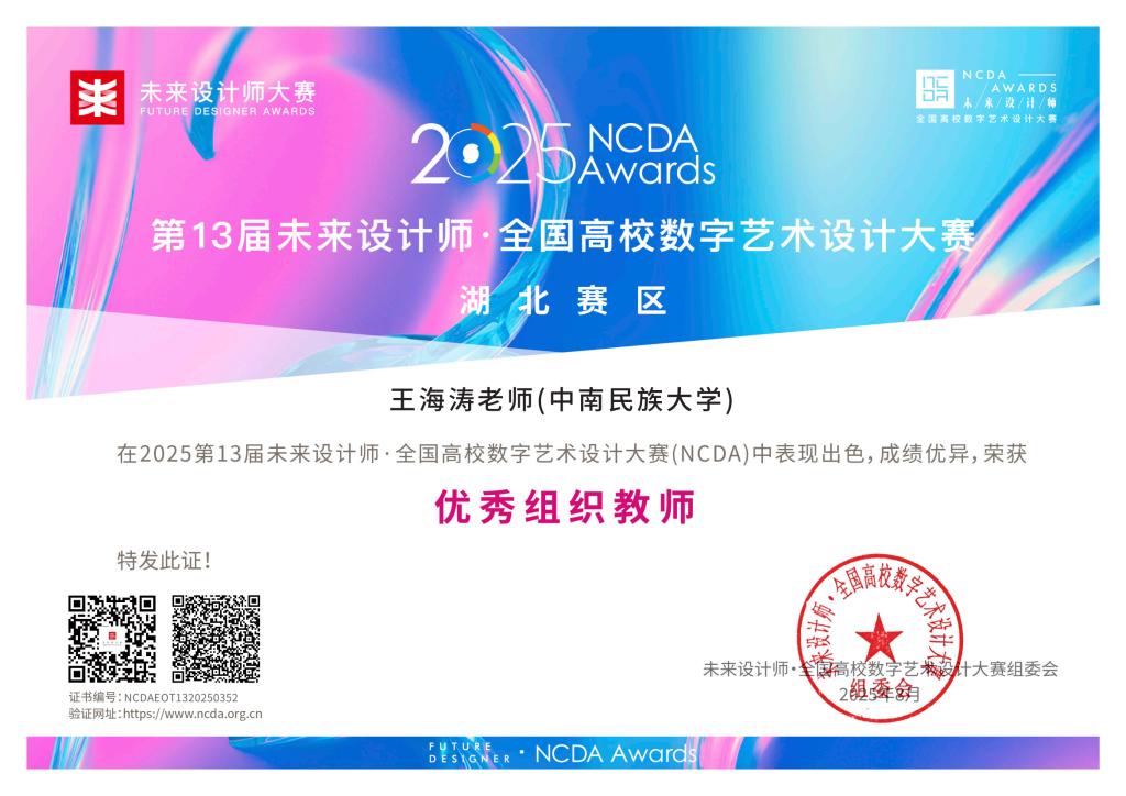 8月28日,威尼斯官网收到第13届未来设计师·全国高校数字艺术设计大赛(NCDA)组委会发来的获奖通知书,威尼斯官网学子喜获省奖37项、国奖8项。威尼斯官网荣获优秀组织奖,王海涛老师荣获优秀组织教师奖。
