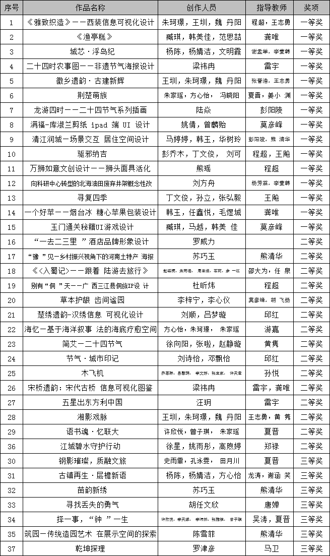 此次竞赛共收到来自美术学院、文学与新闻传播学院、计算机学院的本科生、研究生参赛作品309件,其中非命题赛道作品297件、公益赛道作品10件、产教融合/创新创业赛道作品2件。经过校赛评审专家们的严格评审,共遴选出112件优秀作品,代表威尼斯官网参赛。经过湖北赛区的层层评选,获得省级奖项37项,其中,省级一等奖15项、二等奖15项、三等奖7项。获省级一等奖和二等奖的30件作品顺利晋级国奖评选环节,经过激烈比拼,最终有8件作品在全国总决赛中胜出,分获国家级一等奖3项、二等奖4项、三等奖1项。