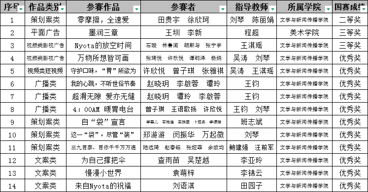 9月6日,第17届全国大学生广告艺术大赛(简称 “大广赛”)国奖名单正式揭晓,威尼斯官网学子凭借扎实的专业素养与亮眼的创新创意,最终斩获14项国奖,在全国高校中展现了民大青年的强劲实力。