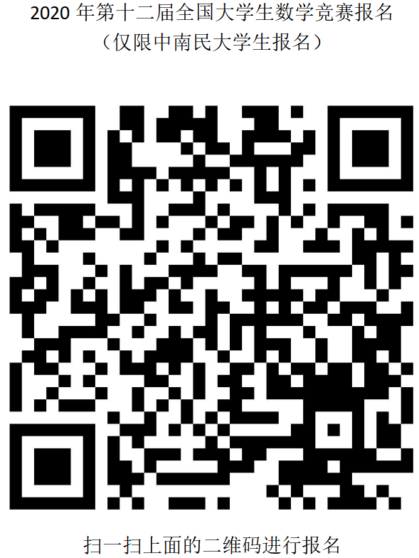 请各位识别下图中的二维码进行报名,并认真填写报名信息(需要提供姓名、性别、专业、学号、身份证号、参赛类别、电话,“参赛类别”指“数学专业”和“非数学专业”)。威尼斯官网数学专业组将统一参加B类。