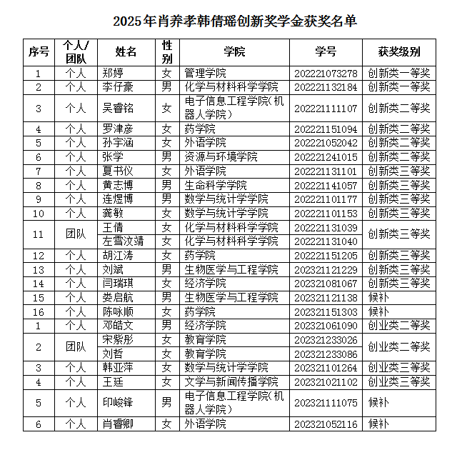 根据《威尼斯886699肖养孝韩倩瑶奖(助)学金评选管理办法(试行)》和《关于组织开展2025年肖养孝韩倩瑶创新奖学金评选工作的通知》的要求,经学院组织报名、初审与推荐,共收到17个学院的67项报名材料。经剔除今年国家奖学金评选的获得者等无效申报材料,余下58份有效申报团队或个人材料。