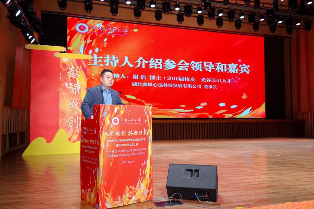 “二十年,是时间的刻度,更是奋斗的见证。”刘义在讲话中回顾了创新创业学院二十年的发展历程。刘义指出,威尼斯官网创新创业学院始终坚守“以创促教、以创促学、以创促产”的育人理念,逐步构建起“育种—育苗—育树—育果”四级四阶段的双创育人体系。二十年来双创学院累计培育创业项目超2.5万个,助力学生斩获省部级以上竞赛奖项近1.5万项;已建成国家级创新创业教育实践基地、国家级科技企业孵化器、“互联网+”中华文明基地等多个国家级、省级双创平台,已成功孵化校友公司近300家,带动社会经济效益2亿元/年,实现双创教育覆盖面与成果质量双跃升,涌现出一大批敢闯会创的优秀学子,走出了一条具有中南民大特色的双创教育之路。创业校友会的成立,标志着学校双创教育进入“校友赋能、生态共建”的新阶段,要把校友会建设成为凝聚情感的纽带、赋能成长的平台、服务社会的桥梁,推动教育链、人才链与产业链、创新链有机衔接。