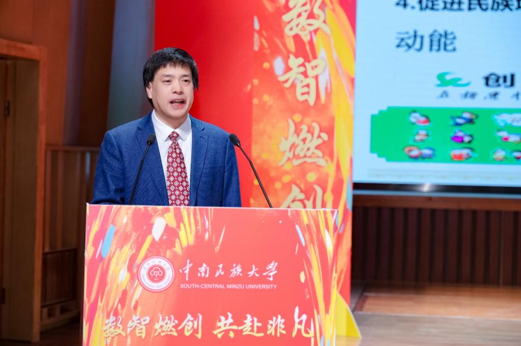 华中科技大学李仁府教授作为嘉宾代表致辞,高度评价中南民大双创学院建设成就,并呼吁两校在未来深化合作