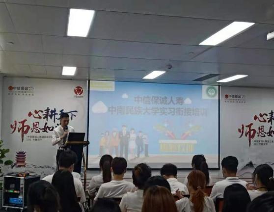 本次实习的班主任是谢露老师,在中信保诚已经有12年的工作经历,谢露老师正在培训教室里等待着同学们的到来。由光谷职场负责人闻武总进行开训致辞,“怀揣感恩之心”是开训辞的核心,实习生们都深刻地认同这一点。谢露老师进行了公司的介绍,并期待实习生们能在此次实习之后,热爱上这个行业!