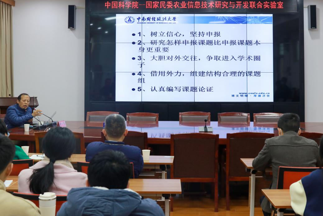 本站讯(记者:甘剑慧)为增进学院国家项目申报质量,提高项目申报水平,12月7日下午,经济学院于15号教学楼801会议室召开了国家项目申报专题辅导讲座。讲座特邀中南财经政法大学二级教授、博士生导师严立冬主讲,经济学院部分老师与同学到场聆听和学习。讲座由经济学院党委副书记、院长李波主持。