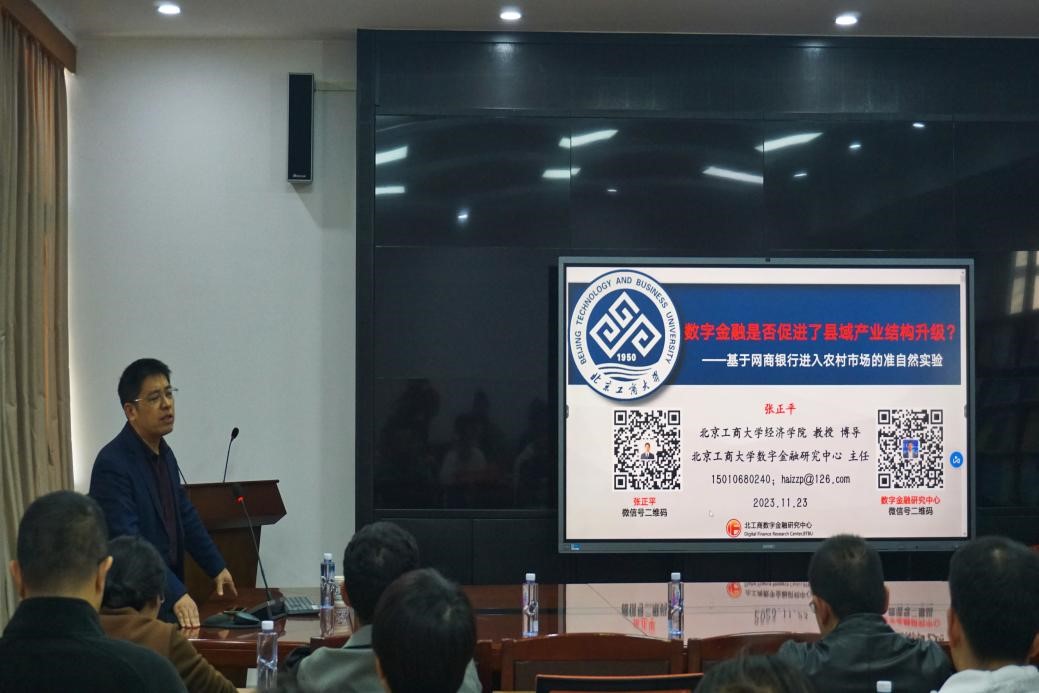 11月23日下午,经济学院于15号教学楼801会议室举办了“数字金融是否促进了县城产业结构升级”主题讲座。讲座特邀北京工商大学经济学院金融系教授、博士生导师,北京工商大学数字金融研究中心主任张正平主讲,经济学院部分教师及学生到场聆听。讲座由学院副院长熊芳主持。