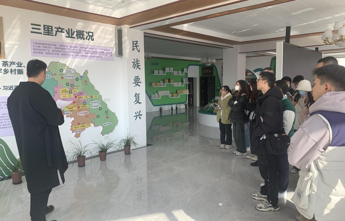 在三里村综合展厅,解说员向同学们介绍三里城镇产业发展现状,聚焦绿色发展、创新发展、融合发展。在做强做大传统产业—茶产业的同时,大力推广稻鳅共作、稻鸭共育绿色生态种养业,强力发展兰花、油牡丹、太空莲、金丝皇菊等新型特色产业,推动特色产业与乡村旅游深度融合。