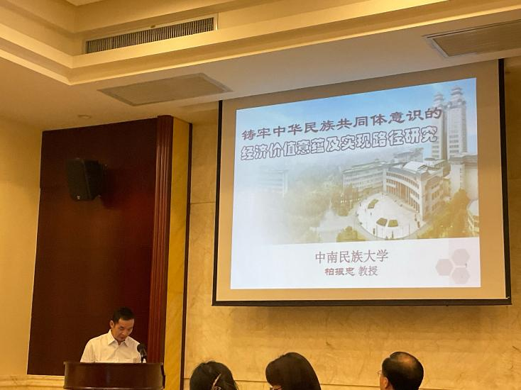 论坛中,柏振忠教授以《铸牢中华民族共同体意识的经济价值意蕴及实现路径研究》为题,从铸牢中华民族共同体意识的经济理论、经济实践、经济方向、经济策略四个方面进行汇报。在理论阐释方面,柏教授团队经数年努力已初步建构涵盖3大主干、11个分支的铸牢中华民族共同体意识经济学理论框架。其中,将该理论架构回归到马克思主义政治经济学基本原理、特别是将所依规的中国特色社会主义经济理论概括为“多元一体”“两个大局”“三者命运共同体”“四化同步”“五位一体”即“一二三四五”等观点,得到了与会学者的普遍认同。而在实践路径方面,柏振忠教授提出,应从推进各区域各民族各阶层之间共享发展成果、推进基本公共服务均等化、推进各民族共同参与国家建设、推进民族地区治理体系治理能力现代化以及提升城市接纳各民族群众的能力和水平等方面入手,进一步铸牢中华民族共同体意识。